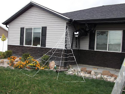 We assembled him out of 4 black garbage bags, 2 stuffed with newspaper, and 2 cut into long legs. The face is simple cardstock paper cut outs. The trick was getting him hung up. It was more trouble than it was worth LOL. But for my first attempt, I didn't do half bad. And that includes my first attempt at the web too. It's supposed to glow in the dark, but my paint I ordered still hasn't arrived.